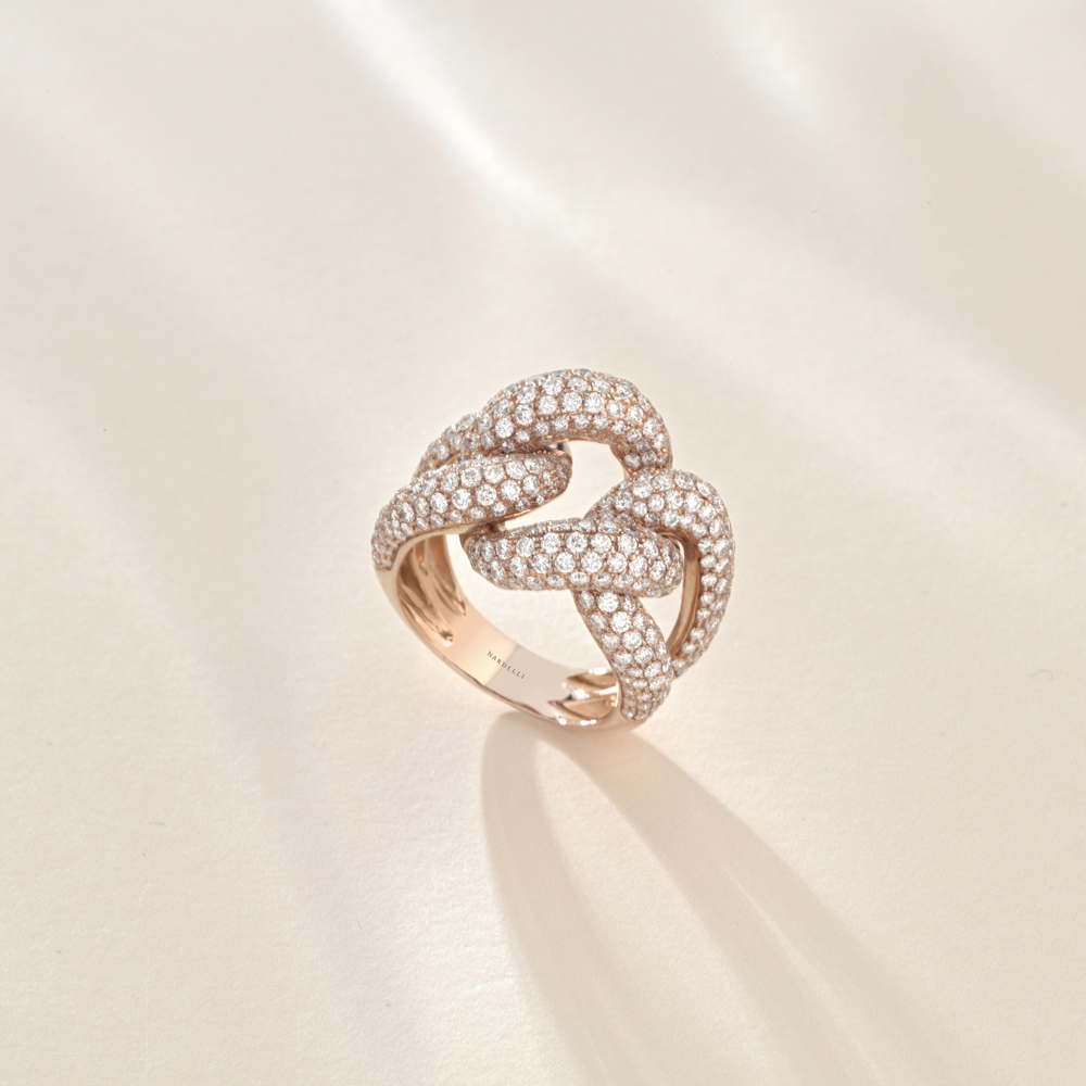 I gioielli della collezione Rosari sono realizzati in oro 18 carati. Tra i gioielli iconici del brand, la rivisitazione in chiave glam del classico anello Rosario con grani in oro o selezionate pietre preziose e croci in diamanti.