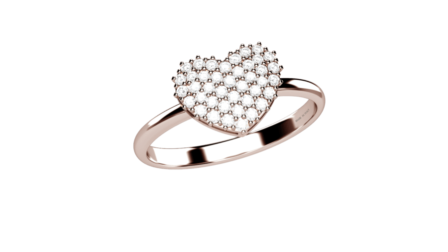 Anello a cuore in oro rosa 18 carati con pavé di diamanti. Un simbolo d’amore impreziosito dalla luce dei diamanti. Peso oro 2.4g, diamanti 0.19ct.