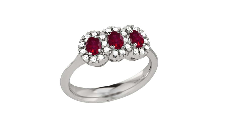Anello trilogy in oro bianco 18 carati con tre rubini circondati da corone di diamanti. Un design sofisticato che esalta il colore delle pietre preziose. Peso oro 2.7g, diamanti 0.2ct, rubini 0.6ct.