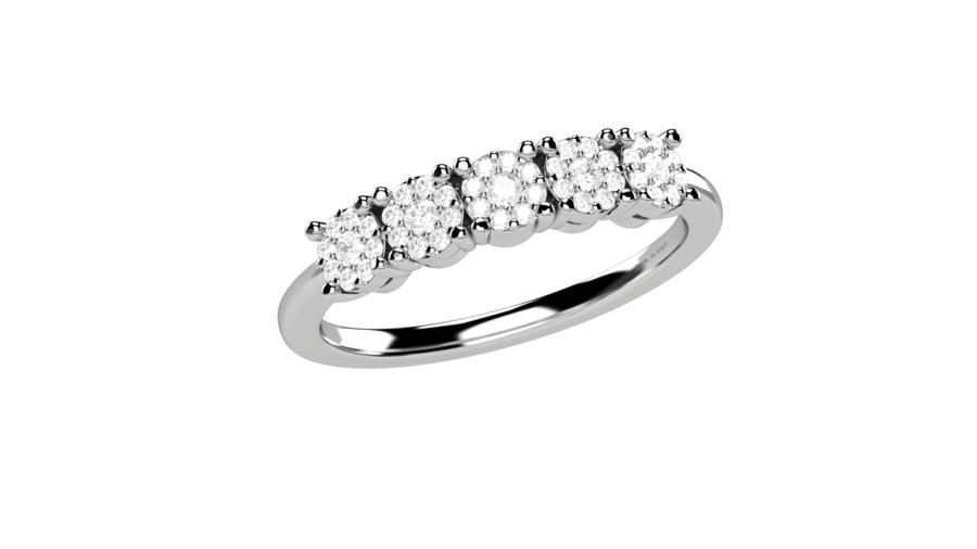 Anello veretta in oro bianco 18 carati con cinque diamanti in montatura illusion. Un design che simboleggia l’eternità, con diamanti che brillano lungo tutta la fascia. Peso oro 2.2g, diamanti 0.16ct.