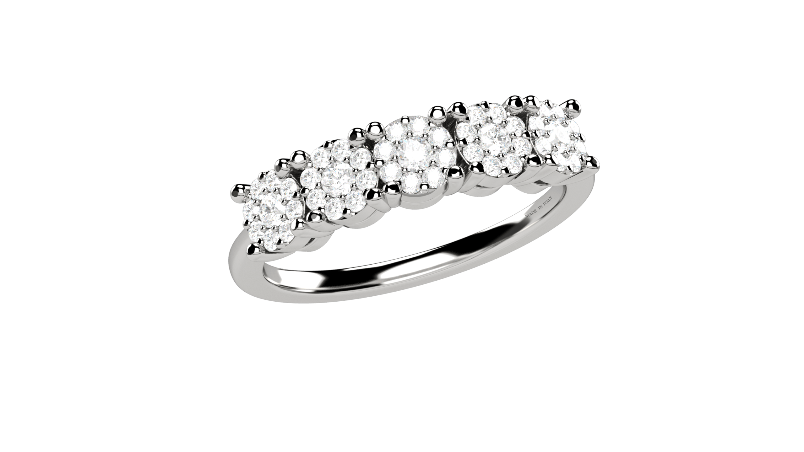 Anello veretta in oro bianco 18 carati con cinque diamanti in montatura illusion. Un design che simboleggia l’eternità, con diamanti che brillano lungo tutta la fascia. Peso oro 2.5g, diamanti 0.25ct.