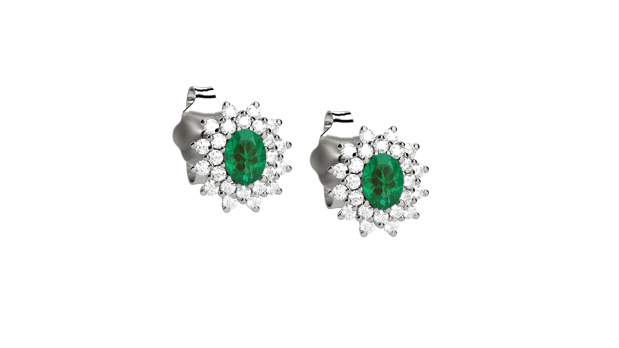 Orecchini classico in oro bianco 18 carati con smeraldo ovale circondato da una corona di diamanti. Un design senza tempo ispirato alla grande tradizione orafa. Peso oro 2.1g, diamanti 0.24ct, smeraldo 0.4ct.
