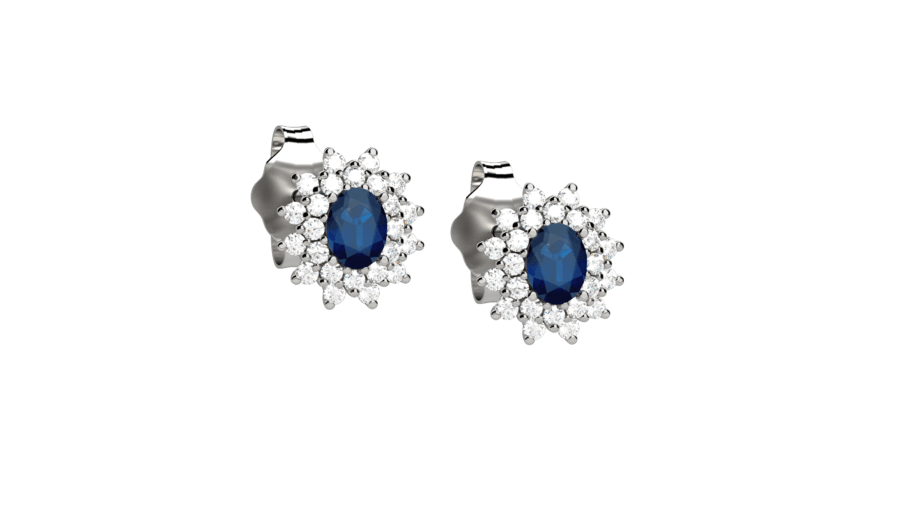 Orecchini classico in oro bianco 18 carati con zaffiro ovale circondato da una corona di diamanti. Un design senza tempo ispirato alla grande tradizione orafa. Peso oro 2.1g, diamanti 0.24ct, zaffiro 0.5ct.