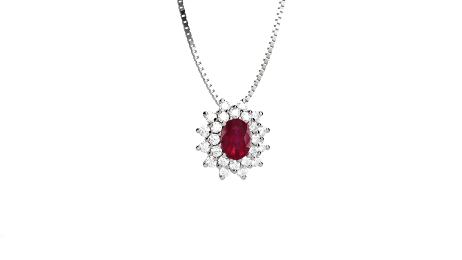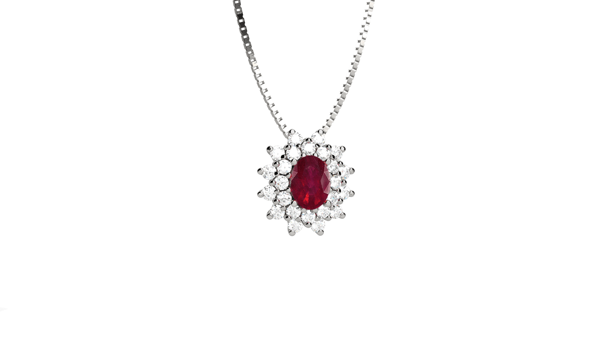 Pendente classico in oro bianco 18 carati con rubino ovale circondato da una corona di diamanti. Un design senza tempo ispirato alla grande tradizione orafa. Peso oro 2.2g, diamanti 0.24ct, rubino 0.4ct.