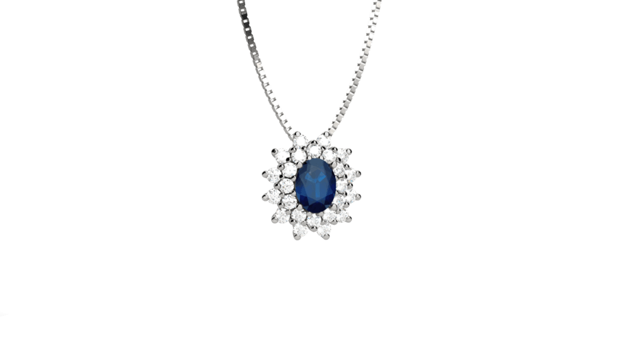 Pendente classico in oro bianco 18 carati con zaffiro ovale circondato da una corona di diamanti. Un design senza tempo ispirato alla grande tradizione orafa. Peso oro 2.2g, diamanti 0.24ct, zaffiro 0.4ct.