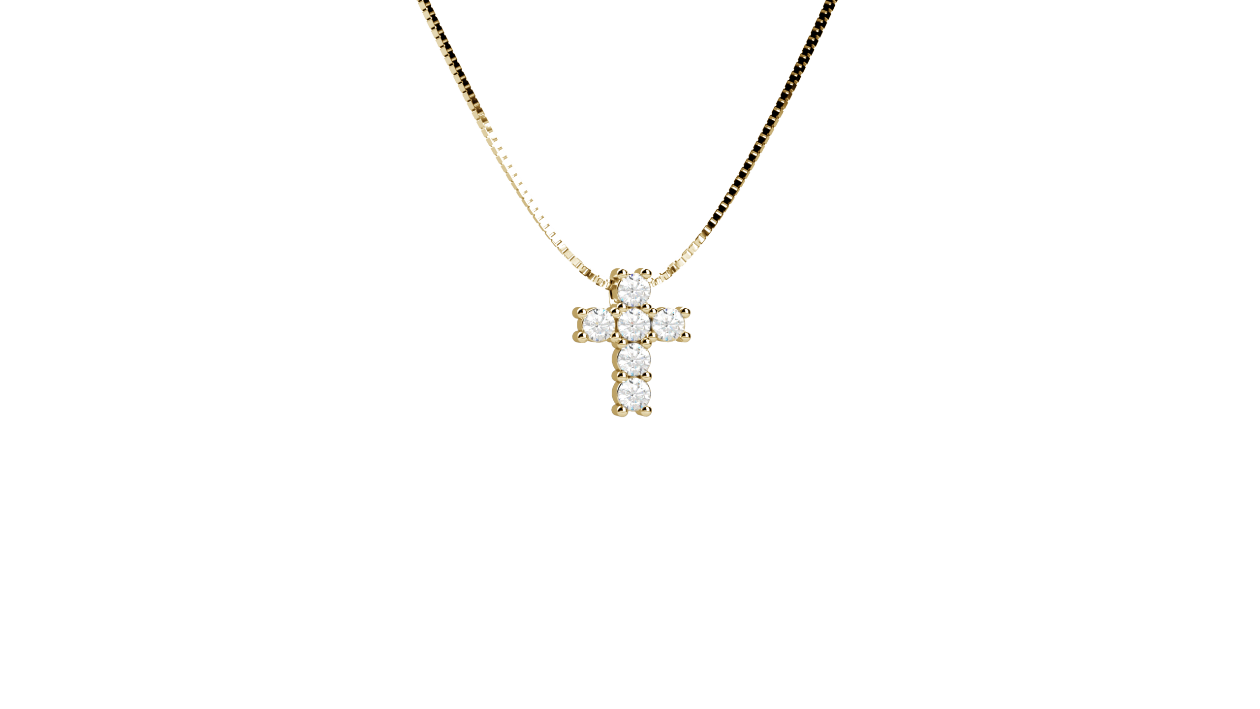 Pendente a croce in oro giallo 18 carati con diamanti. Un simbolo prezioso impreziosito dalla luce dei diamanti. Peso oro 1.8g, diamanti 0.12ct.