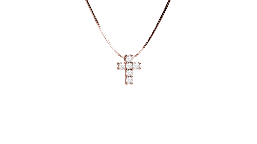 Pendente a croce in oro rosa 18 carati con diamanti. Un simbolo prezioso impreziosito dalla luce dei diamanti. Peso oro 1.8g, diamanti 0.12ct.