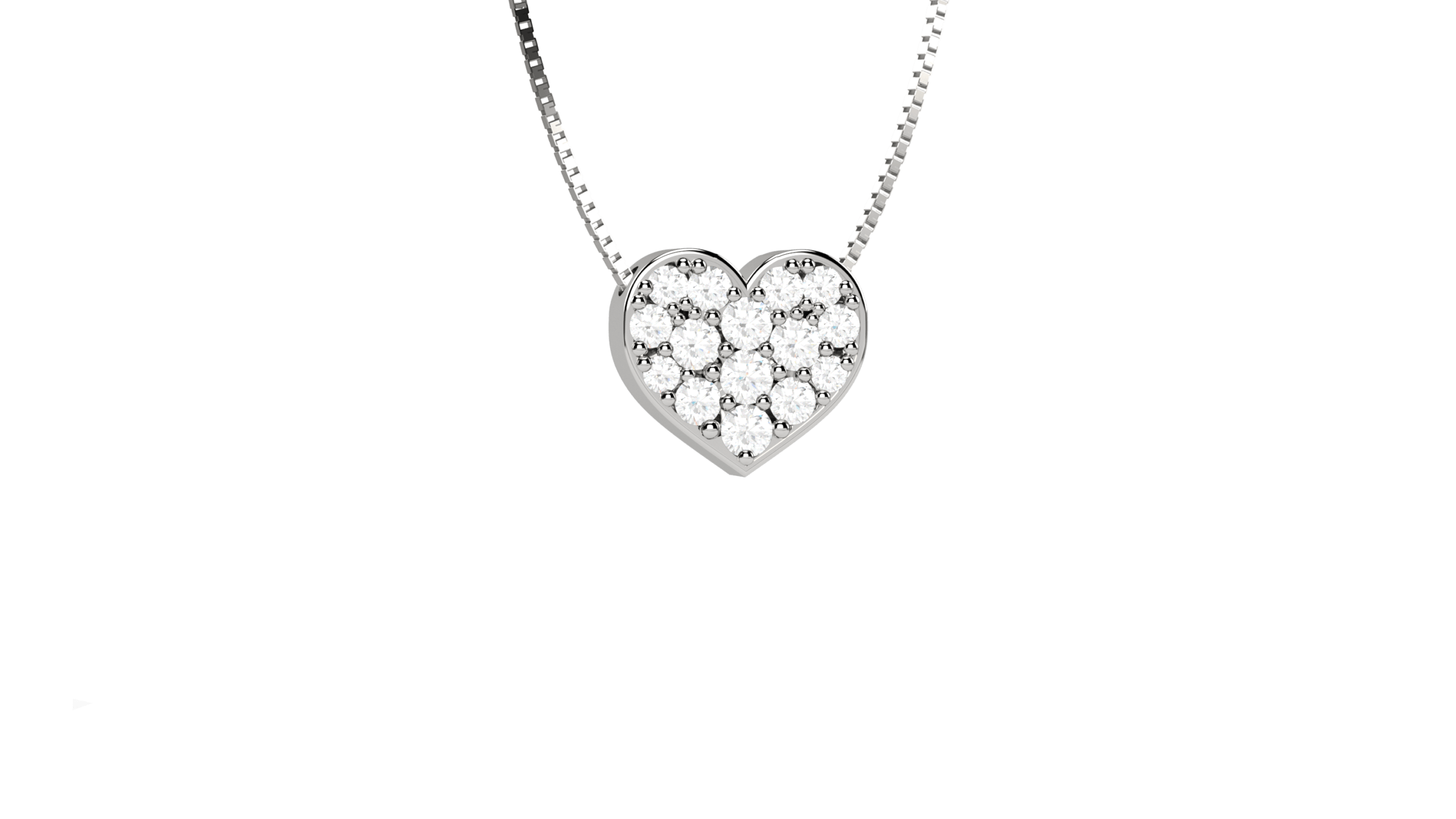 Pendente a cuore in oro bianco 18 carati con pavé di diamanti. Un simbolo d’amore impreziosito dalla luce dei diamanti. Peso oro 2.3g, diamanti 0.09ct.