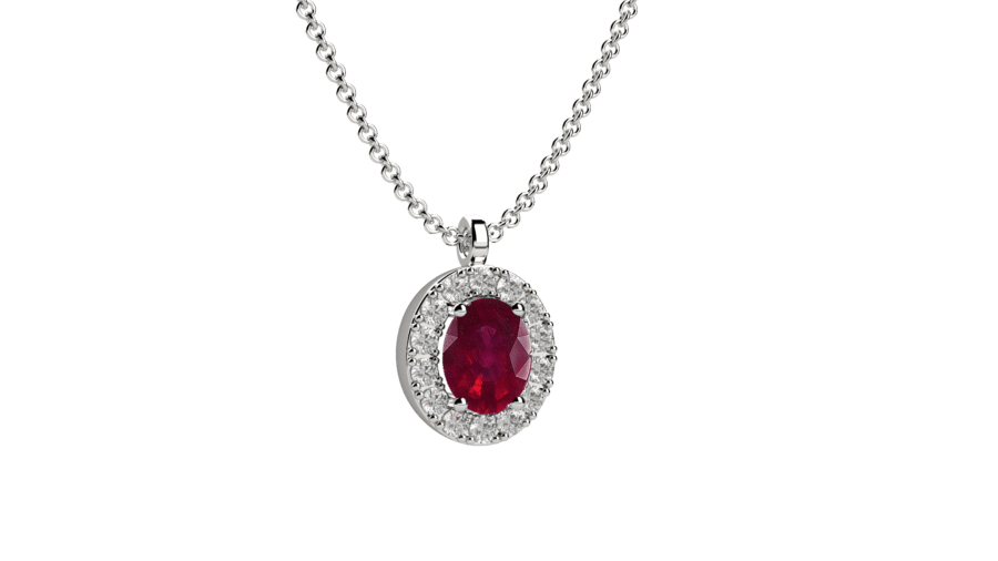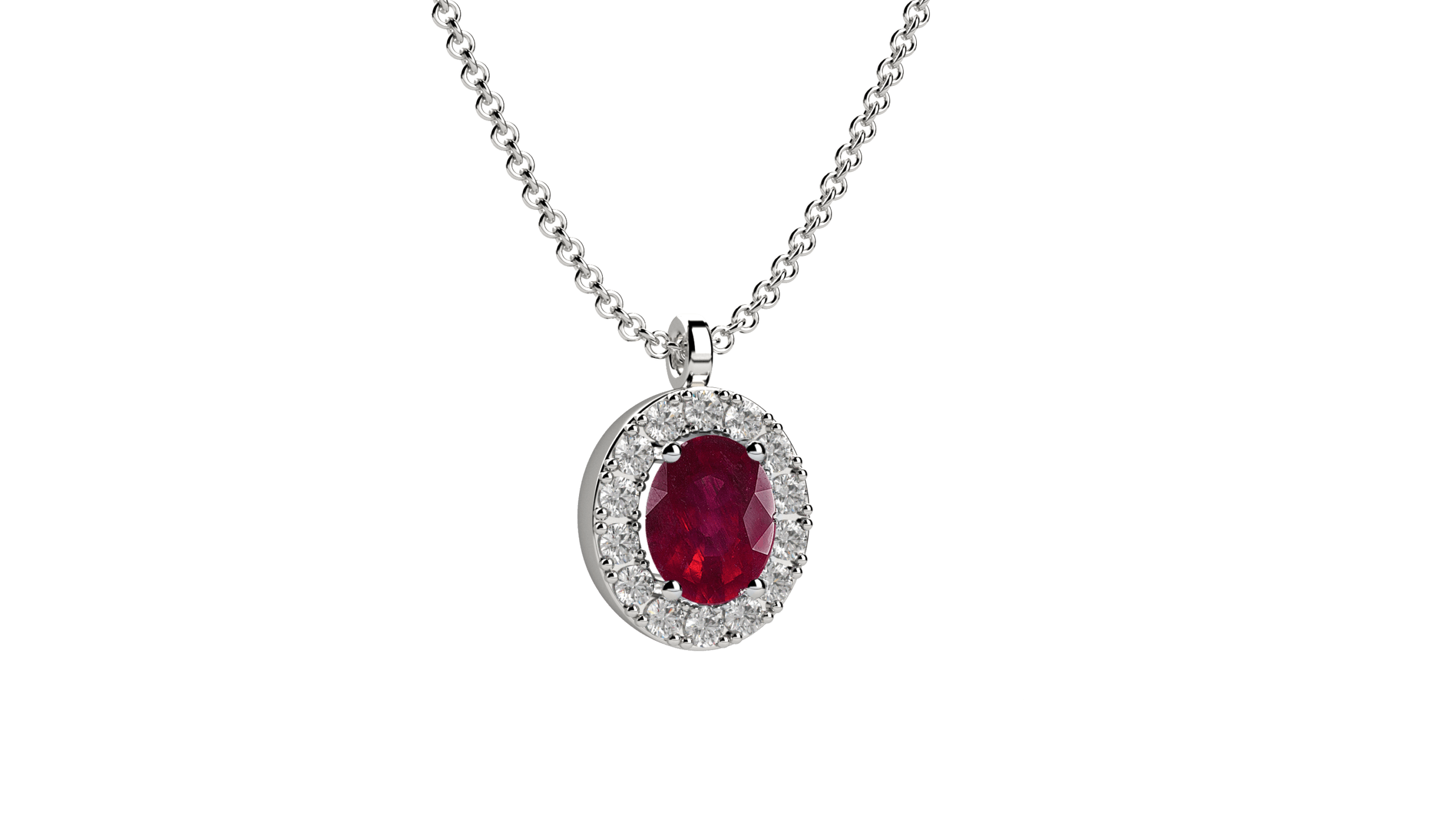 Pendente halo in oro bianco 18 carati con rubino centrale circondato da una corona di diamanti. Un design che esalta la bellezza della pietra preziosa. Peso oro 2.7g, diamanti 0.1ct, rubino 0.4ct.