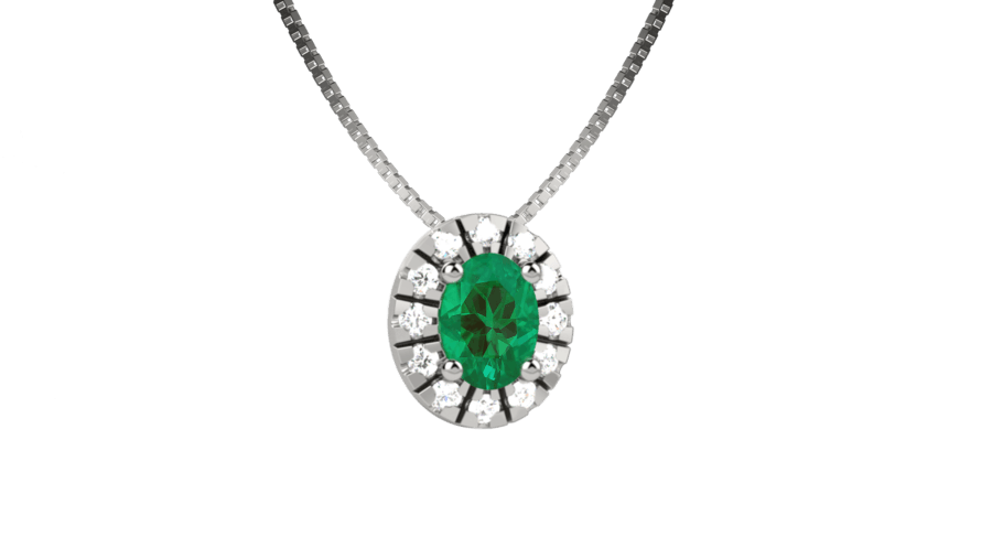 Pendente halo in oro bianco 18 carati con smeraldo centrale circondato da una corona di diamanti. Un design che esalta la bellezza della pietra preziosa. Peso oro 1.6g, diamanti 0.04ct, smeraldo 0.16ct.