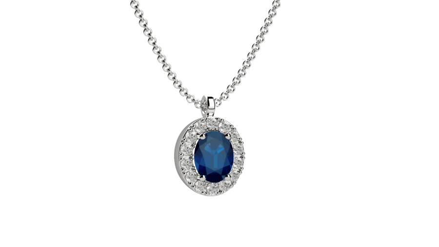 Pendente halo in oro bianco 18 carati con zaffiro centrale circondato da una corona di diamanti. Un design che esalta la bellezza della pietra preziosa. Peso oro 2.7g, diamanti 0.1ct, zaffiro 0.4ct.