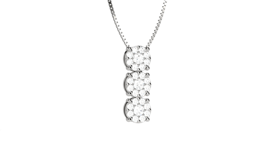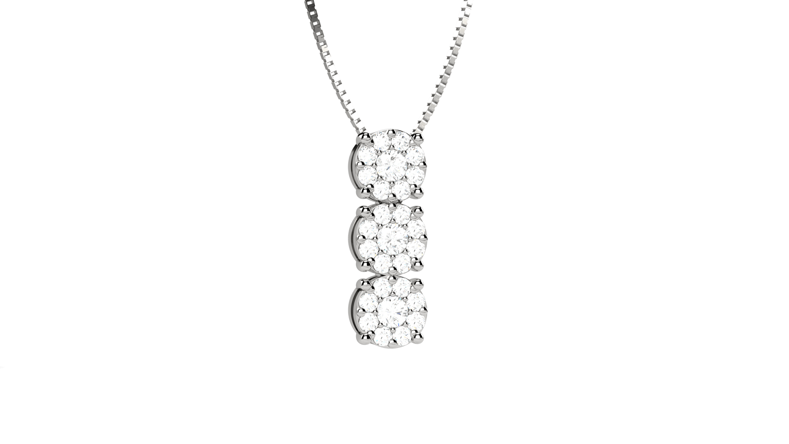 Pendente trilogy in oro bianco 18 carati con diamanti in montatura illusion. Tre pietre che simboleggiano passato, presente e futuro, amplificate dalla montatura illusion. Peso oro 1.9g, diamanti 0.11ct.