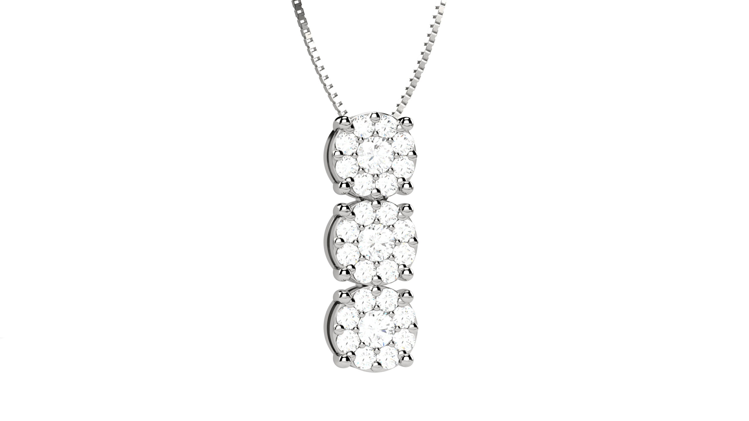 Pendente trilogy in oro bianco 18 carati con diamanti in montatura illusion. Tre pietre che simboleggiano passato, presente e futuro, amplificate dalla montatura illusion. Peso oro 2.6g, diamanti 0.31ct.